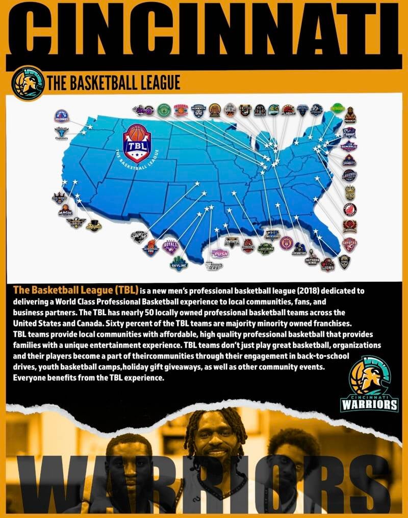 The Cincinnati Warriors is a premier professional basketball organization based in Cincinnati Ohio. We compete in the world renowned (TBL) "THE BASKETBALL LEAGUE". Our mission is dedicated to developing young athletes into high-level players and helping established players transition to other avenues. Our focus is on skill development, teamwork, and sportsmanship.